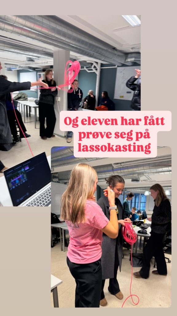Lassokasting ble en HIT på skolebesøkene. Her ser vi ett bilde fra Elvebakken videregående skole der elevene i pausen fikk prøve lassokasting. Elevene fikk et kræsjkurs i kasteteknikk og kveiling av lasso.