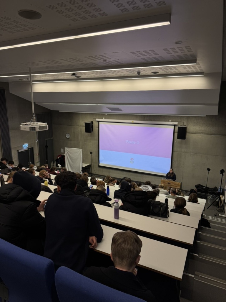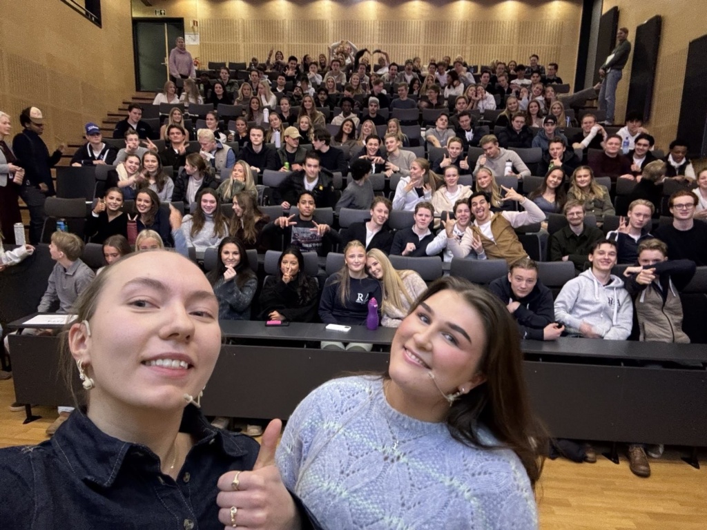 Klokken slår 08:15 i det elevene strømmer inn og det store auditoriet fylles opp med stemmer. Vi har fått en fin rutine før selve forelesningen. Håkon kobler opp til projektoren og sjekker at lyden er grei, mens jeg sjekker praktiske ting, for eksempel: lysbrytere og musikk. Alt er på plass og nå gjelder det å få oppmerksomheten deres i hele 90 minutter. Jeg tar et åndedrag og fyller lungene før jeg puster ut og senker skuldrene. Øynene speider utover salen og møter en god blanding av sjenerte, alvorlige, glade og nysgjerrige blikk. Jeg kikker på Håkon og vi nikker til hverandre og fyrer løs.